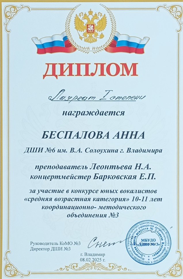 По итогам конкурсных прослушиваний был вручён диплом Лауреата I степени.