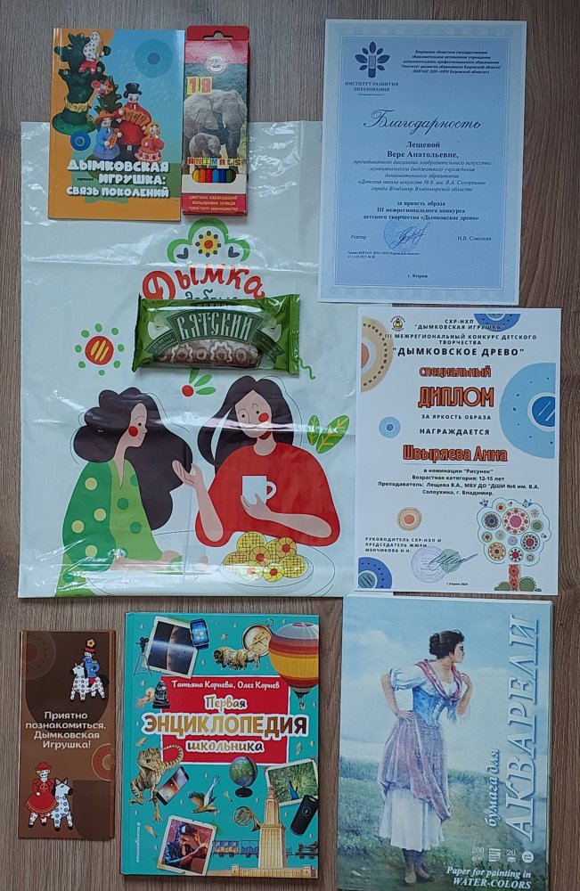 Специальным Дипломом "За яркость образа" и подарком отмечена работа Швыряевой Ани "Праздничный натюрморт с дымковской игрушкой" (преподаватель Лещёва Вера Анатольевна).