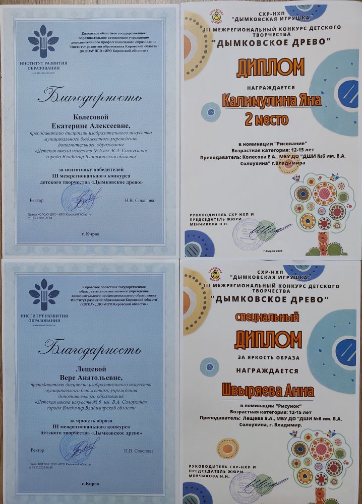Труд преподавателей юных победителей конкурса отмечен Благодарностями ректора института образования Кировской области. Поздравляем наших юных художников и их преподавателей с успехами в конкурсе!