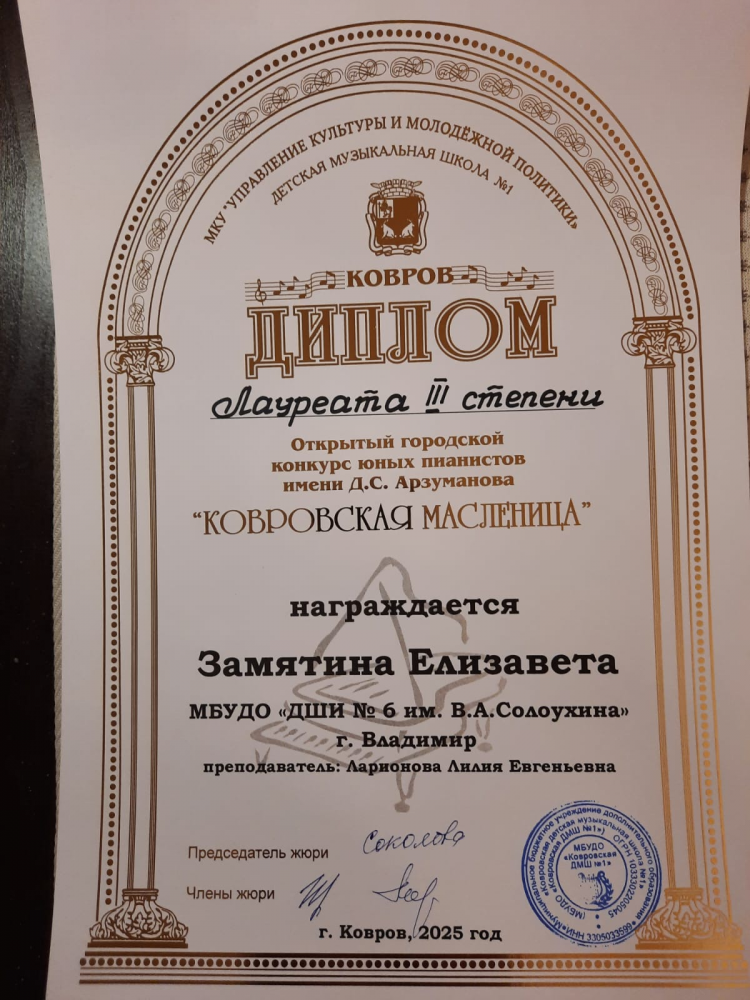 26 февраля в ДМШ №1 г. Коврова состоялся очередной открытый городской конкурс юных пианистов им. Д. С. Арзуманова «Ковровская масленица». Учащаяся нашей школы Замятина Елизавета стала призёром конкурса. Поздравляем Лизу и её преподавателя Ларионову Лилию Евгеньевну с успешным выступлением! Желаем творческих успехов и вдохновения на дальнейшую работу!