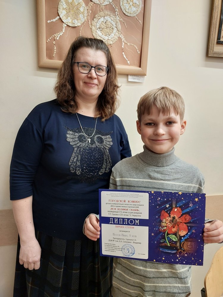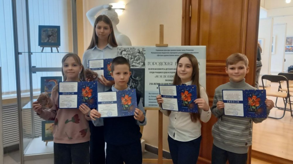 19 марта в Детской художественной школе города Владимира состоялось награждение победителей городского конкурса «Мои любимые сказки». Конкурс посвящён 210-летию со дня рождения Петра Павловича Ершова и 220-летию Ганса Христиана Андерсена - выдающихся сказочников. В конкурсе приняли участие 125 работ учащихся детских школ искусств города Владимира № 3,4,5,6 и детской художественной школы. Всего 45 победителей в двух номинациях: живопись и графика, в трех возрастных категориях.