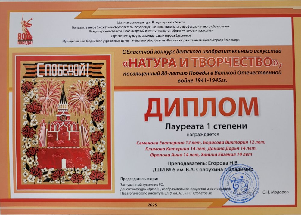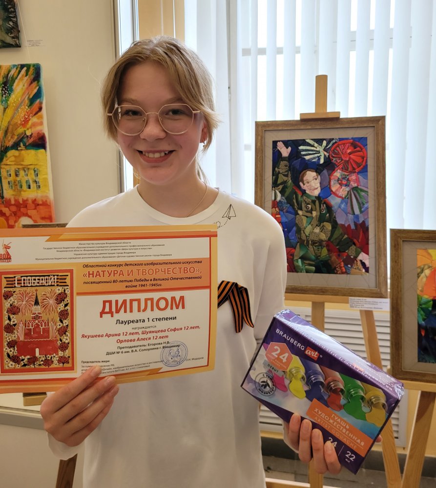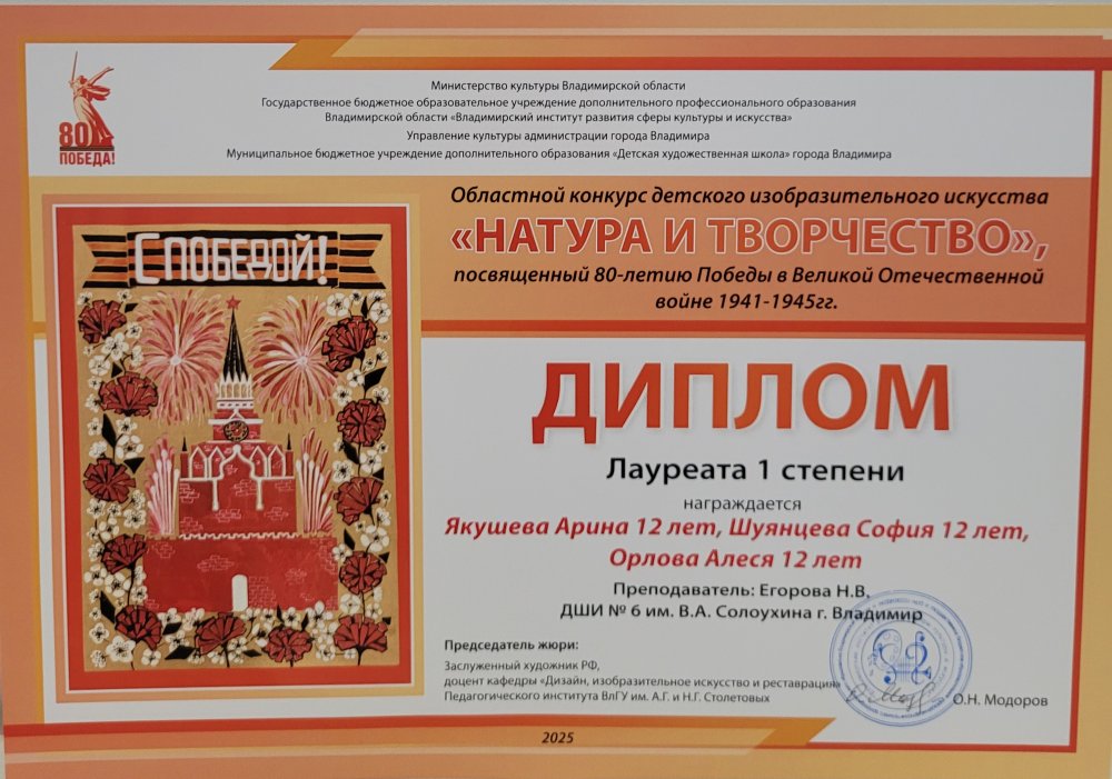 30 апреля в выставочном зале Детской художественной школы г. Владимира состоялось торжественное награждение победителей и лауреатов конкурса «Натура и творчество», посвященного 80-летию Победы в Великой Отечественной войне.