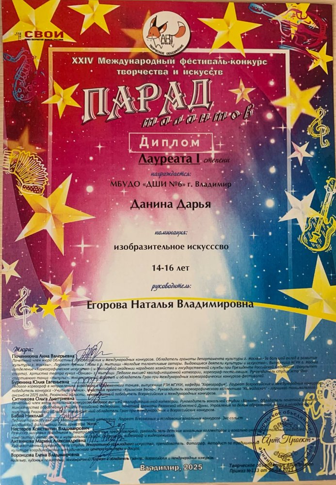 Учащаяся художественного отделения Данина Даша (преп. Егорова Н.В.) приняла участие в XXIV Международном фестивале-конкурсе в художественно-хореографическом конкурсе творчества и искусств. Жюри отметило ее работу и стиль рисования и присудили 1 место.