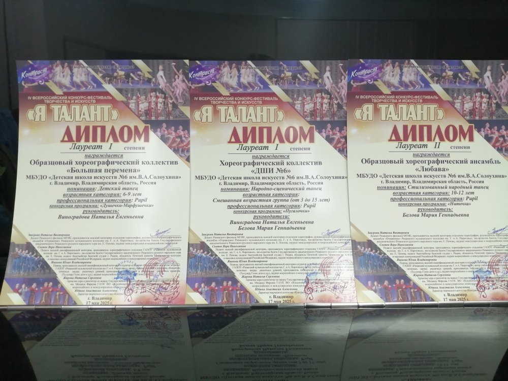 17 мая в Городском Дворце Культуры проходил IV Всероссийский конкурс-фестиваль творчества и искусств "Я - талант". Образцовые хореографические коллективы "Большая перемена" (руководитель Виноградова Н. Е.), "Любава" (руководитель Белова М. Г.) и коллектив "ДШИ №6" (руководители Виноградова Н. Е. и Белова М. Г.) принимали в нём активное участие.
