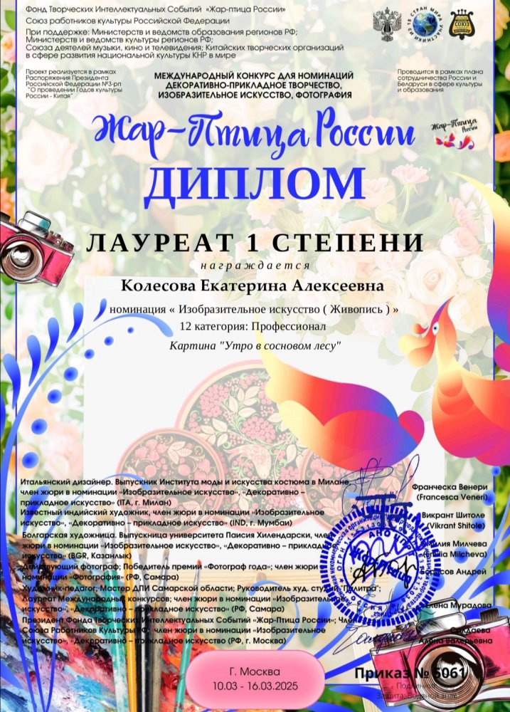 Педагог художественного отделения нашей школы Колесова Екатерина Алексеевна приняла участие в Международном онлайн-конкурсе «Жар–птица России». Конкурс проводился в рамках распоряжения Президента Российской Федерации «О проведении года культуры России и Китая».