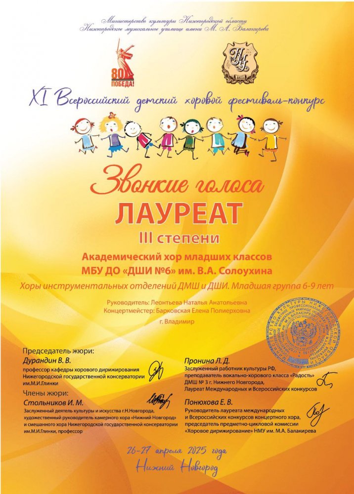 26-27 апреля в г. Нижний Новгород на базе Нижегородского музыкального колледжа прошел XI Всероссийский детский фестиваль-конкурс "Звонкие голоса". Нашу школу достойно представили два хоровых коллектива - Академический хор младших и Академический хор старших классов. Ребята получили дипломы и звание Лауреата III степени и Лауреата II степени. Благодарим руководителя Леонтьеву Н.А. и концертмейстера Барковскую Е.П. за подготовку лауреатов! Желаем дальнейшего исполнительского и творческого роста!