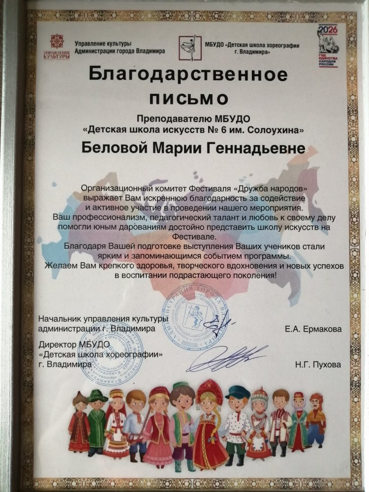 - 17 апреля Образцовый хореографический ансамбль "Любава" (руководитель Белова М. Г.) принимал участие в фестивале "Дружба народов", который состоялся в ЦКИ на Соборной. Ребята достойно представили школу искусств и свой ансамбль на фестивале, а руководитель Мария Геннадьевна получила благодарственное письмо за профессионализм, педагогический талант и любовь к своему делу!