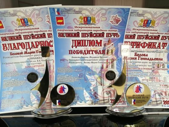 14 сентября участники Образцового хореографического ансамбля "Любава" (руководитель Белова М. Г.) Ананьева Бажена и Макаров Святослав, принимали участие в Гала-концерте Межрегиональной творческой лаборатории по народному танцу "Великий Шуйский путь" в г. Шуя. Ребята не только станцевали на главной площади города, но и поучаствовали в мастер-классах по народному танцу, который проводили: артист балета Антон Бойко из Государственного ансамбля "Березка" и Георгий Перилов артист балета из ансамбля песни и пляски ВДВ Министерства обороны РФ. Участники ансамбля "Любава" были награждены дипломом "Победителя" и сертификатами о прохождении мастер-классов.