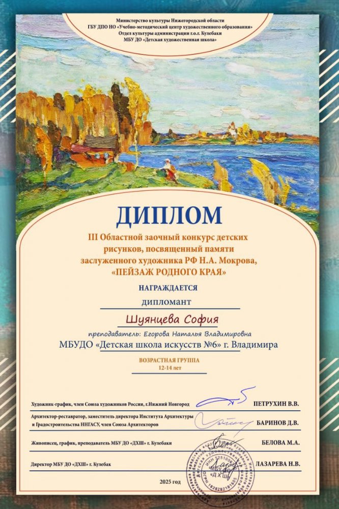 III Областной заочный конкурс детских рисунков, посвящённый памяти заслуженного художника РФ Н.А. Мокрова "Пейзаж родного края", завершился в г. Кулебаки Нижегородской области. Мокров Николай Алексеевич родился в селе Саваслейка Кулебакского района Нижегородской (ранее - Горьковской) области, а его творчество достигло совершенства на Владимирской земле. Вот почему юные художники Нижегородской и Владимирской областей уже несколько лет активно участвуют в конкурсе "Пейзаж родного края", который проводит Министерство культуры Нижегородской области, ГБУ ДПО НО "Учебно-методический центр художественного образования, отдел культуры администрации г.о.г. Кулебаки, МБУДО "Детская художественная школа" г. Кулебаки.
