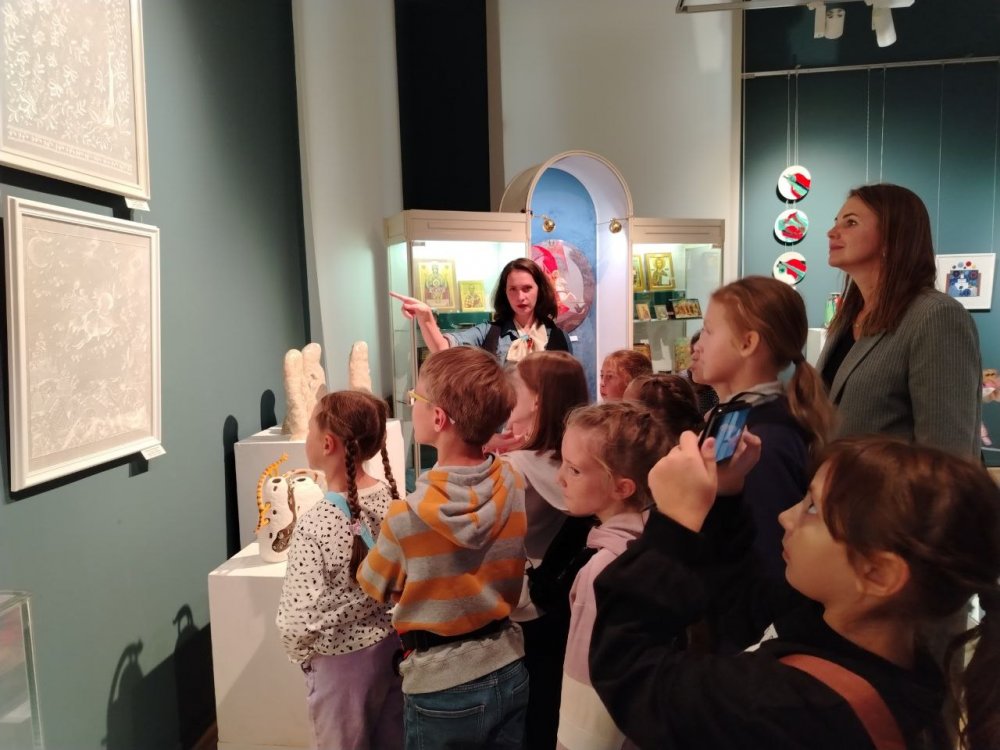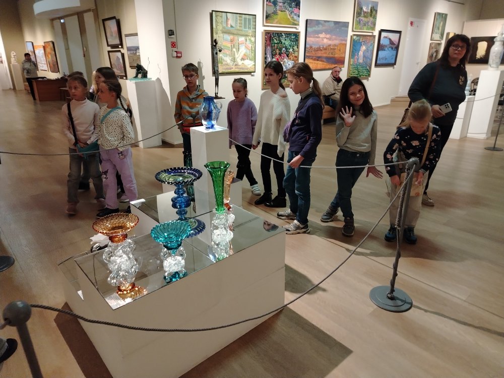 Ребята осмотрели областную выставку "Художники земли Владимирской. 80 лет", где и представлены образцы керамических работ, хрусталя, гобелена, эмалей, вышивки.
