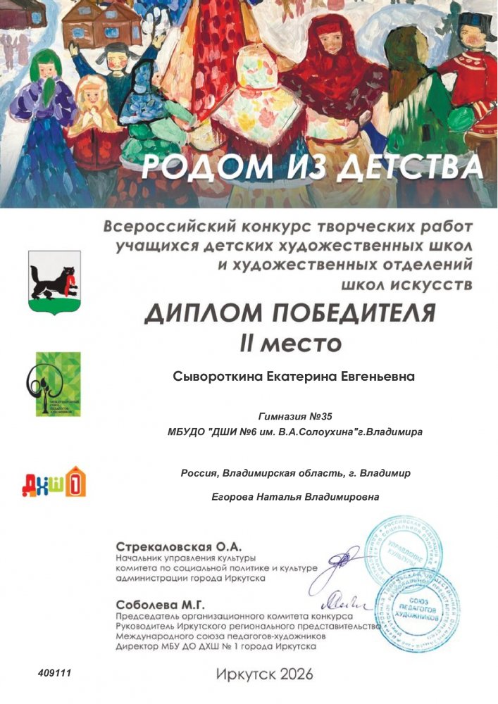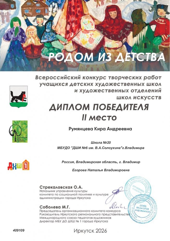 Подведены итоги III Всероссийского конкурса творческих работ учащихся детских художественных школ и художественных отделений школ искусств «Родом из детства». Это было грандиозное путешествие в мир детского творчества! Ребятам предлагалось создать живописные и графические композиции в трех номинациях: творчество, семья, наследие.