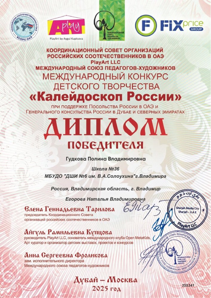 Полина Гудкова, ученица 4-Б класса получила Диплом Победителя!