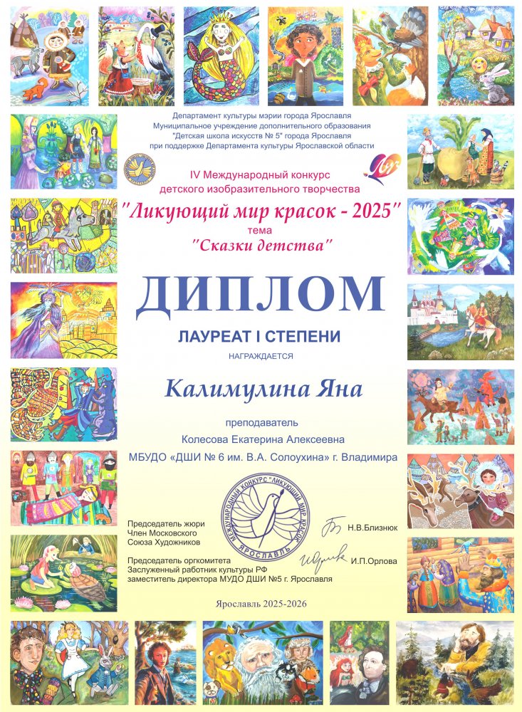 «Ликующий мир красок» — это престижный ежегодный международный конкурс детского изобразительного творчества, который проводится с 2016 года, а с 2022‑го имеет международный статус. Он проходит в Ярославской области и собирает тысячи работ юных художников в возрасте от 7 до 18 лет из регионов России и зарубежных стран. Творческие работы посвящены сказкам, культуре и радости жизни.