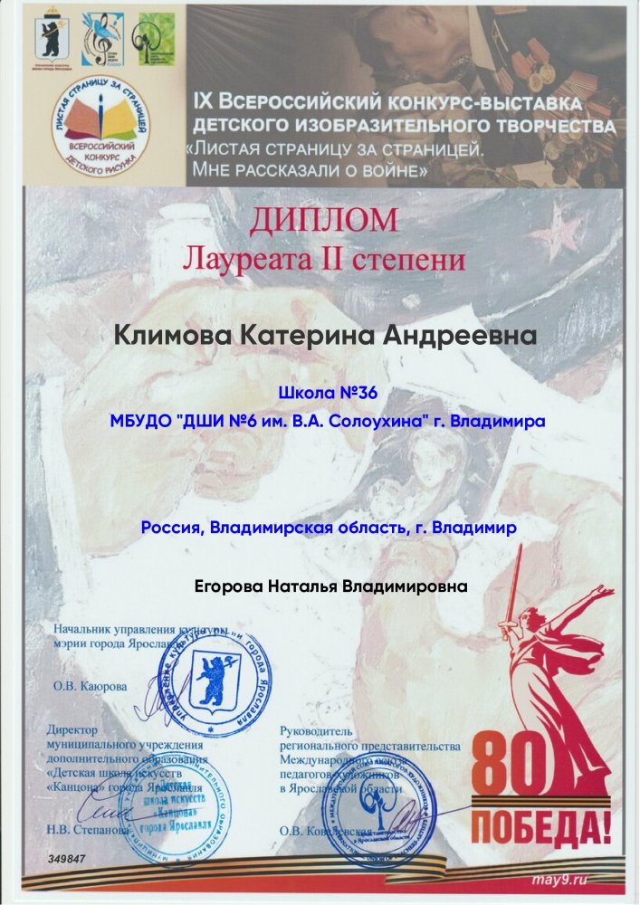 Лауреат 2 степени – Климова Катя (преподаватель Егорова Наталья Владимировна)