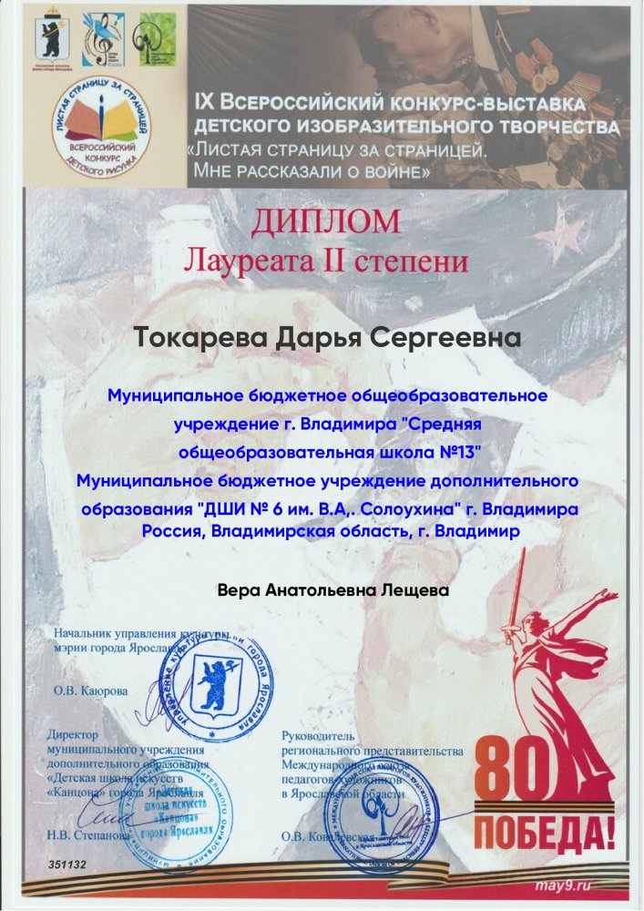 Лауреат 2 степени – Токарева Дарья (преподаватель Лещёва Вера Анатольевна).
