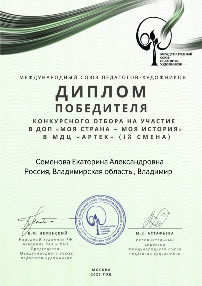 Семенова Екатерина, учащаяся 7 класса преп. Егоровой Н.В., стала победителем конкурсного отбора на участие в дополнительной общеразвивающей программе «Моя страна – моя история» в МДЦ «Артек», которая будет реализована на 13 смене с 12-13.11.2025 по 02-03.12.2025. Это своеобразный Гран-При Всероссийского изобразительного диктанта. Поздравляем!