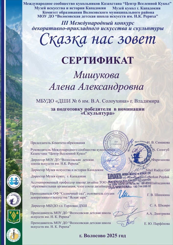 В результате работы жюри Безрукова Анастасия награждена Дипломом III степени международного конкурса, а педагог по скульптуре Мишукова А.А. получила сертификат за подготовку конкурсанта.