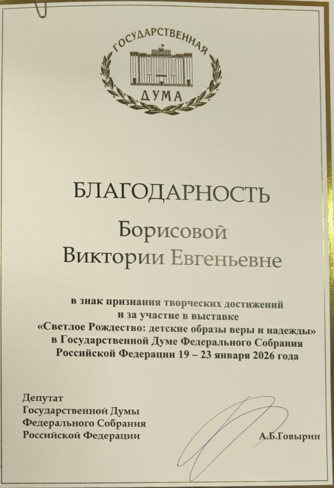 Борисова Вика, ученица 7 класса художественного отделения ДШИ №6 им. В.А. Солоухина (преподаватель Егорова Наталя Владимировна), в канун зимних праздников получила настоящий новогодний подарок: она была приглашена в Государственную Думу Российской Федерации, чтобы принять участие в торжественном открытии выставки «Светлое Рождество. Детские образы веры и надежды».