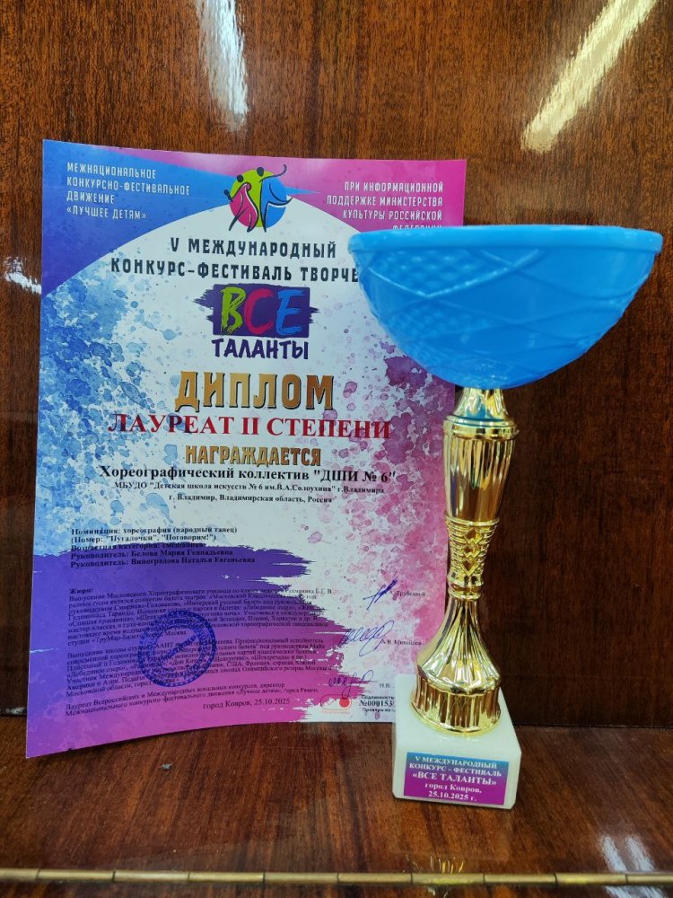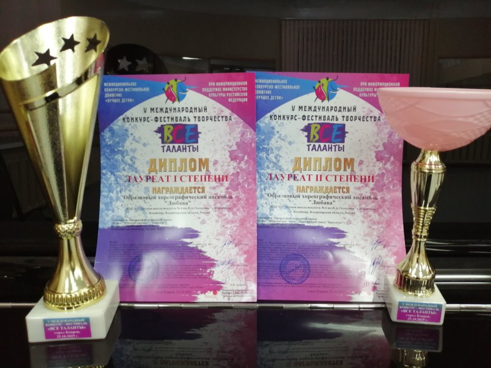 25 октября образцовые хореографические коллективы "Большая перемена" (руководитель Виноградова Н.Е.), "Любава" (руководитель Белова М.Г.) и коллектив "ДШИ №6" принимали участие в Международном конкурсе - фестивале "Все таланты" в г. Ковров.