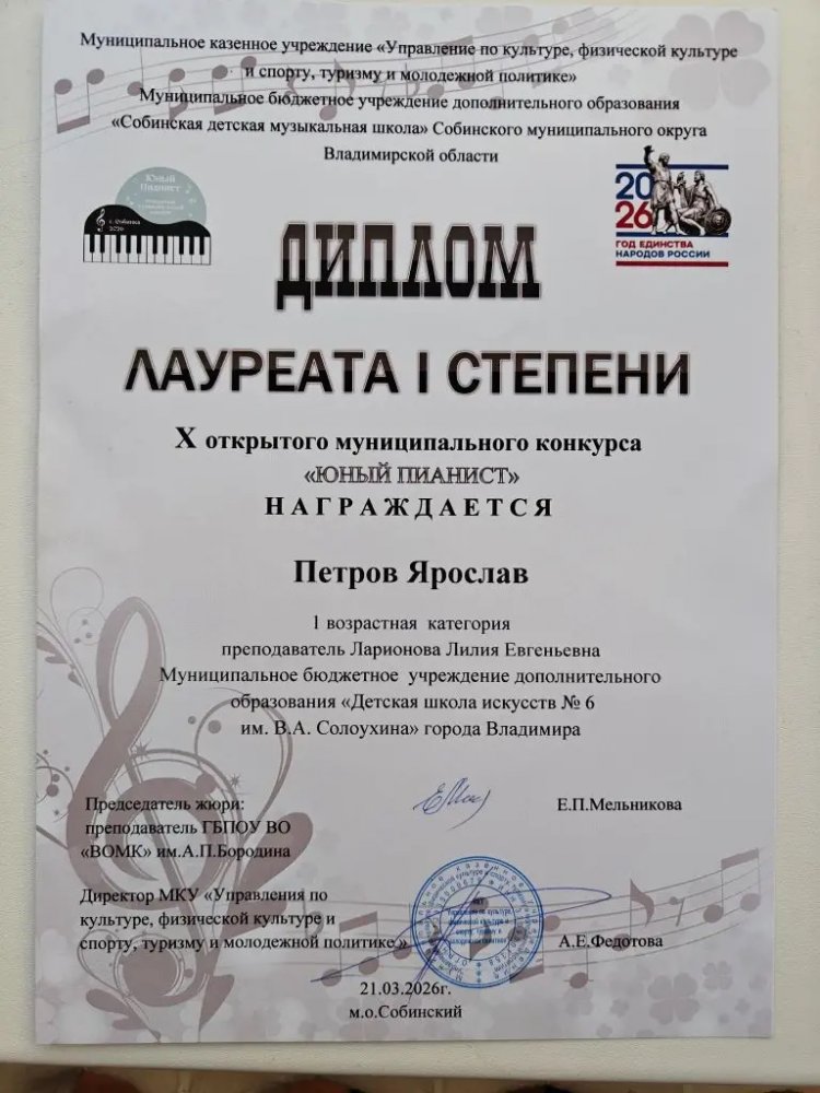 Поздравляем Петрова Ярослава и его преподавателя Ларионову Лилию Евгеньевну с победой в X зональном конкурсе исполнителей на фортепиано «Юный пианист», который проходил 21 марта в Собинской детской музыкальной школе. Желаем ярких побед и новых творческих достижений!